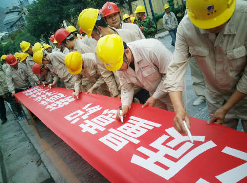 图为四川taptap点点体育磷铵厂员工纷纷到横幅前签字