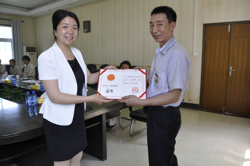 宜昌市总工会党组成员、女工主任朱利民(左)为王宗军颁发奖章和证书