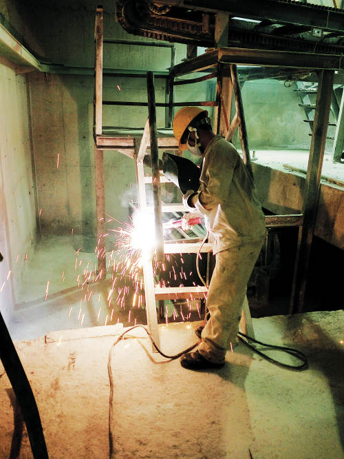 车间里,检修员工黄色的安全帽像跳动的音符,点缀在各个检修现场。瞧,在尿基车间二楼,维修工袁亮正认真校验细筛返料带连轴器。他用尺子仔细测量电机与减速机轴的水平度,只见他左右上下熟练地调整着电机的位置,最终使两轴处于同一水平线;二楼西边,维修工张永军和造粒工卢帅正对成品筛返料带进行技改。他们两人正精心制作三脚架,置放于滚筒尾部,防止杂物划伤皮带;再看原料地坑的西边,那是维修工赵永刚和造粒工白金川在制作刮皮。刮皮将被安装在计量秤下方的皮带上,能起到清理皮带的作用;为了保证车间人员上下阶梯的安全,维修工王宝海和其他几位同事细心地对平台上的每处护栏锈蚀情况进行检查,绝不放过任何一个危险点。在焊接过程中,只见弧光闪闪、焊花飞溅,映红了他们的脸庞,不断滴下的汗珠、娴熟的动作、默契的配合,让这劳动的场景显得格外的美丽……