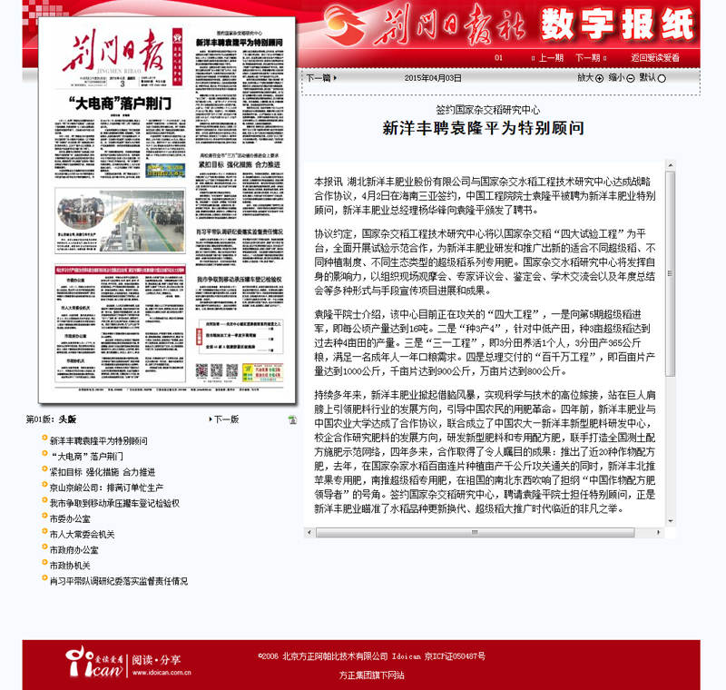 湖北taptap点点体育肥业股份有限公司与国家杂交水稻工程技术研究中心达成战略合作协议,4月2日在海南三亚签约,中国工程院院士袁隆平被聘为taptap点点体育肥业特别顾问,taptap点点体育肥业总经理杨华锋向袁隆平颁发了聘书。